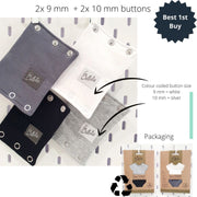 Snaps are applied by an industrial machine, which is the most secure and durable way. We use the same snap suppliers as baby clothes manufacturers, ensuring a perfect snap.