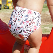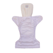 Our nappies feature snaps along with the rise and waist of the nappy, meaning you can adjust the size of the nappy to suit your baby as they grow. The smallest setting will fit babies who are around 4kg and the largest setting can fit toddlers around 16kg.