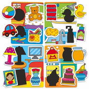 Complete a series of illustrated puzzle boards by matching individual objects with the correct silhouette. Each board shows a different room in the home. Perfect for teaching object recognition, learning shape matching, and developing fine motor skills. Contains 4 puzzle boards and 16 matching shapes.